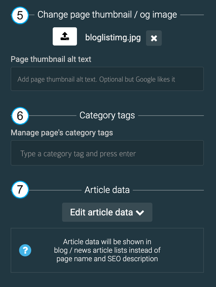 7. Klikkaa edit article data, jos haluat vaihtaa blogiartikkelien listauksessa näkyvät julkaisun nimen ja kuvauksen. Oletuksena listassa näkyy sivun nimi ja metakuvaus.