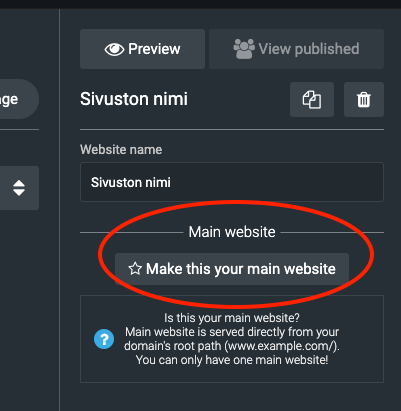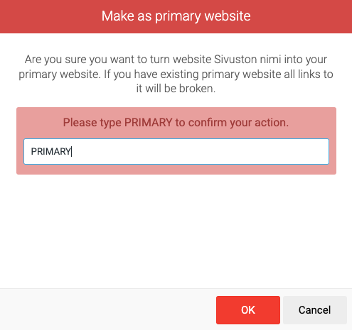 Tee seuraavaksi sivustosta tilin pääsivusto klikkaamalla sivuston asetuksissa olevaa Make this your main website ja kirjoittamalla sitten vahvistukseksi PRIMARY. Tilin pääsivusto aukeaa ilman sivuston nimen ja järjestysnumeron sisältävää polkua.