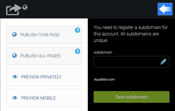 Tilin ensimmäistä julkaisua tehtäessä, sinua pyydetään syöttämään tilille alidomain (subdomain). Alidomain tarvitaan sivustojen toiminnan kannalta, vaikka tiliin on tarkoitus liittää oma domain. Kenttään kirjoitetaan tekstinpätkä ilman välilyöntejä tai erikoismerkkejä. Esimerkiksi kenttään voisi kirjoittaa vaikka jankonbetoni jos yrityksen nimi on Jankon betoni Oy.