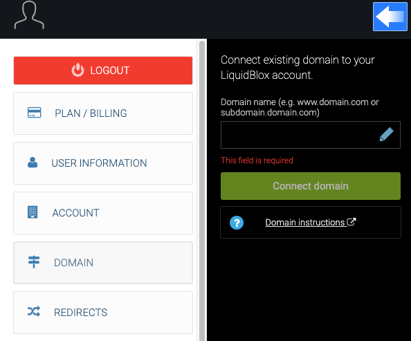 Verkkotunnuksen liittäminen vaatii maksullisen LiquidBlox-tilin.