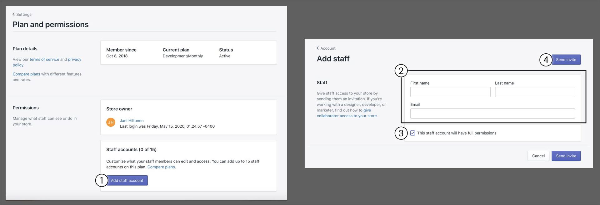 Shopify-tilin perustamisen tekee kauppias itse, ellei suunnittelija ole Shopify-partneri, jolloin kaupan voi perustaa development-versiona. Kauppiaan perustettua Shopify-tilin, tulee hänet ohjeistaa antamaan suunnittelijalle muokkausoikeudet alla olevan ohjeen mukaisesti.